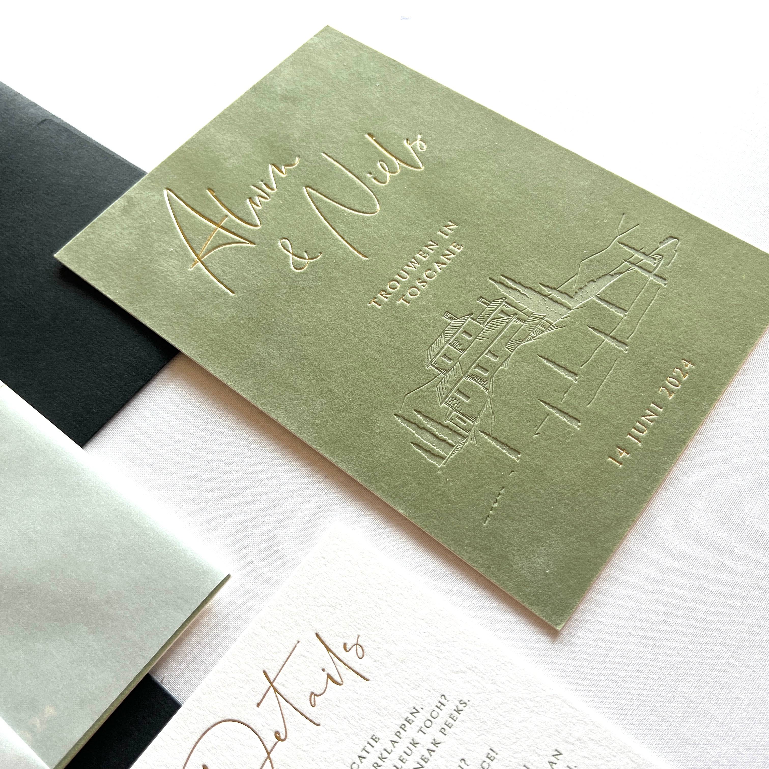 Letterpress is een druktechniek waarbij we inkt eerst op kleur mengen en vervolgens op het papier drukken. Hierdoor krijg je reliëf in het papier.